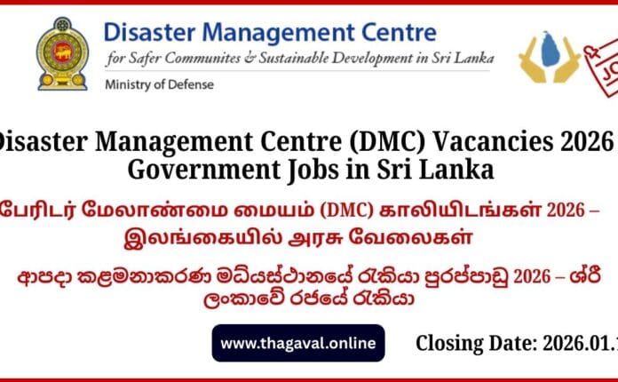 Education / English Post / Government JobsDisaster Management Centre (DMC) Vacancies 2026 β Government Jobs in Sri Lanka December 30, 2025December 30, 2025 - by Jaber - Leave a Comment Disaster Management Centre (DMC) Vacancies 2026 β Government Jobs in Sri Lanka Full Details
