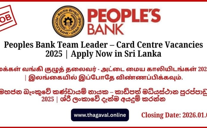 English Post / Government Jobs / Sinhala Post / Tamil PostPeoples Bank Team Leader β Card Centre Vacancies 2025 | Apply Now in Sri Lanka December 28, 2025December 28, 2025 - by Jaber - Leave a Comment Peoples Bank Team Leader β Card Centre Vacancies 2025 | Apply Now in Sri Lanka Full Details