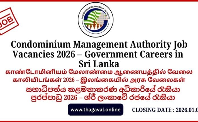 English Post / Government Jobs / Sinhala Post / Tamil PostCondominium Management Authority Job Vacancies 2026 – Government Careers in January 3, 2026January 3, 2026 - by Jaber - Leave a Comment Condominium Management Authority Job Vacancies 2026 – Government Careers in Full Details
