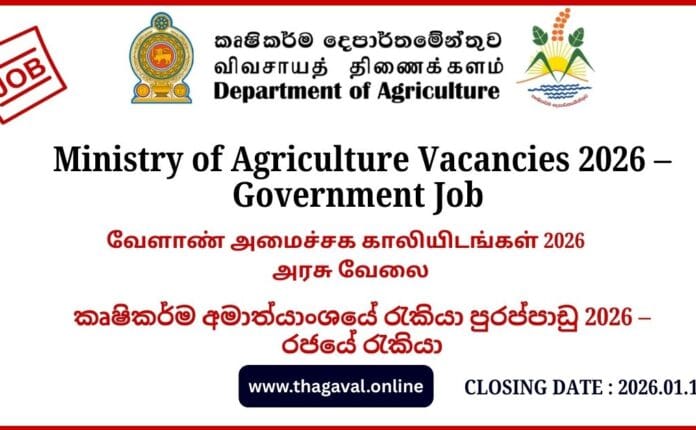 Education / English Post / Government Jobs / Sinhala Post / Tamil PostMinistry of Agriculture Vacancies 2026 – Government Job January 3, 2026January 3, 2026 - by Jaber - Leave a Comment Ministry of Agriculture Vacancies 2026 – Government Job Full Details