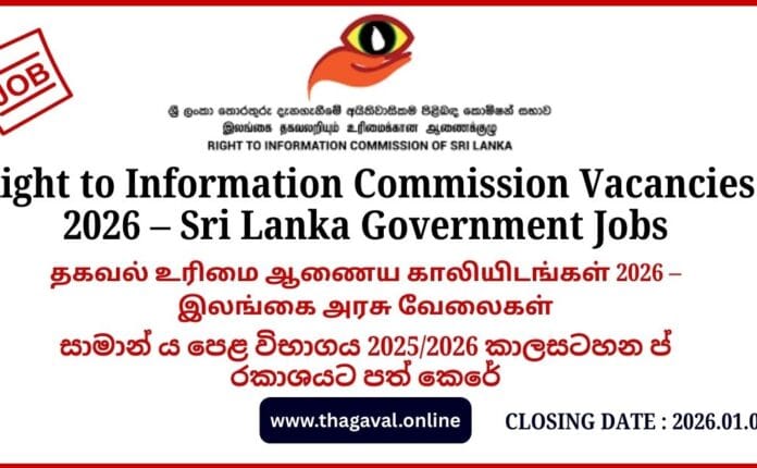 Education / English Post / Government Jobs / Sinhala Post / Tamil PostRight to Information Commission Vacancies 2026 – Sri Lanka Government Jobs January 2, 2026January 2, 2026 - by Jaber - 1 Comment Right to Information Commission Vacancies 2026 – Sri Lanka Government Jobs Full Details