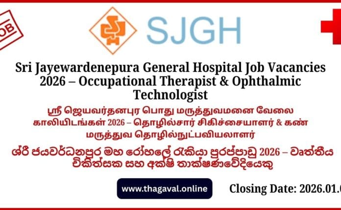 English Post / Government Jobs / Sinhala Post / Tamil PostSri Jayewardenepura General Hospital Job Vacancies 2026 – Occupational Therapist & Ophthalmic Technologist January 1, 2026January 1, 2026 - by Jaber - Leave a Comment Sri Jayewardenepura General Hospital Job Vacancies 2026 – Occupational Therapist & Ophthalmic Technologist Full Details