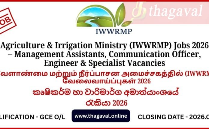English Post / Government Jobs / Sinhala Post / Tamil PostAgriculture & Irrigation Ministry (IWWRMP) Jobs 2026 β Management Assistants, Communication Officer, Engineer & Specialist Vacancies January 19, 2026January 19, 2026 - by Jaber - Leave a Comment Agriculture & Irrigation Ministry (IWWRMP) Jobs 2026 β Management Assistants, Communication Officer, Engineer & Specialist Vacancies Full Details