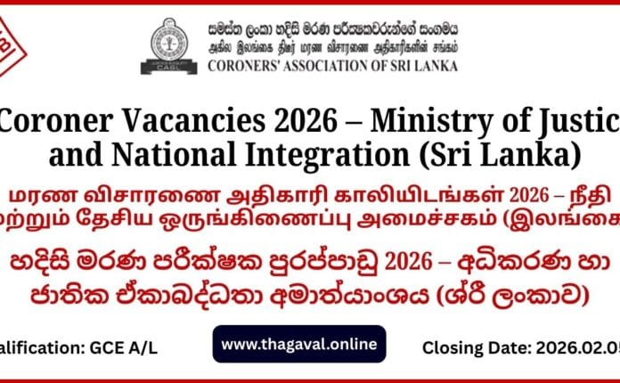 English Post / Government Jobs / Sinhala Post / Tamil PostCoroner Vacancies 2026 β Ministry of Justice and National Integration (Sri Lanka) January 11, 2026January 11, 2026 - by Jaber - Leave a Comment Coroner Vacancies 2026 β Ministry of Justice and National Integration (Sri Lanka) Full Details