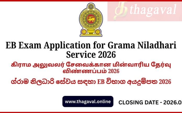 English Post / Government JobsEB Exam Application for Grama Niladhari Service 2026 β Sri Lanka Government Recruitment January 16, 2026January 16, 2026 - by Jaber - Leave a Comment EB Exam Application for Grama Niladhari Service 2026 β Sri Lanka Government Recruitment Full Details