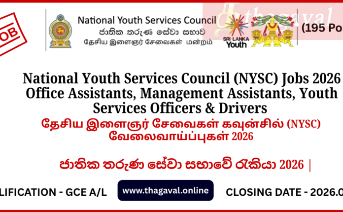 English Post / Government Jobs / Sinhala Post / Tamil PostNational Youth Services Council (NYSC) Jobs 2026 January 17, 2026January 17, 2026 - by Jaber - Leave a Comment National Youth Services Council (NYSC) Jobs 2026 Full Details
