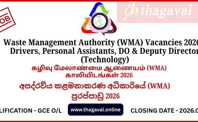 English Post / Government JobsWaste Management Authority (WMA) Vacancies 2026 β Drivers, Personal Assistants, DO & Deputy Director (Technology) January 18, 2026January 18, 2026 - by Jaber - Leave a Comment Waste Management Authority (WMA) Vacancies 2026 β Drivers, Personal Assistants, DO & Deputy Director (Technology) Full Details