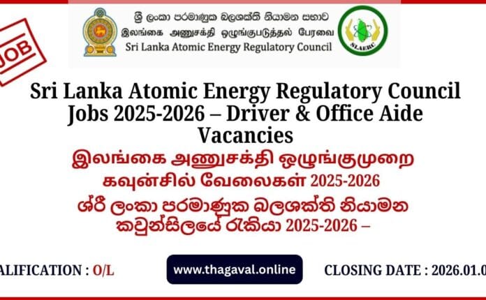 English Post / Sinhala Post / Tamil PostSri Lanka Atomic Energy Regulatory Council Jobs 2025-2026 – Driver & Office Aide Vacancies January 4, 2026January 4, 2026 - by Jaber - Leave a Comment Sri Lanka Atomic Energy Regulatory Council Jobs 2025-2026 – Driver & Office Aide Vacancies Full Details