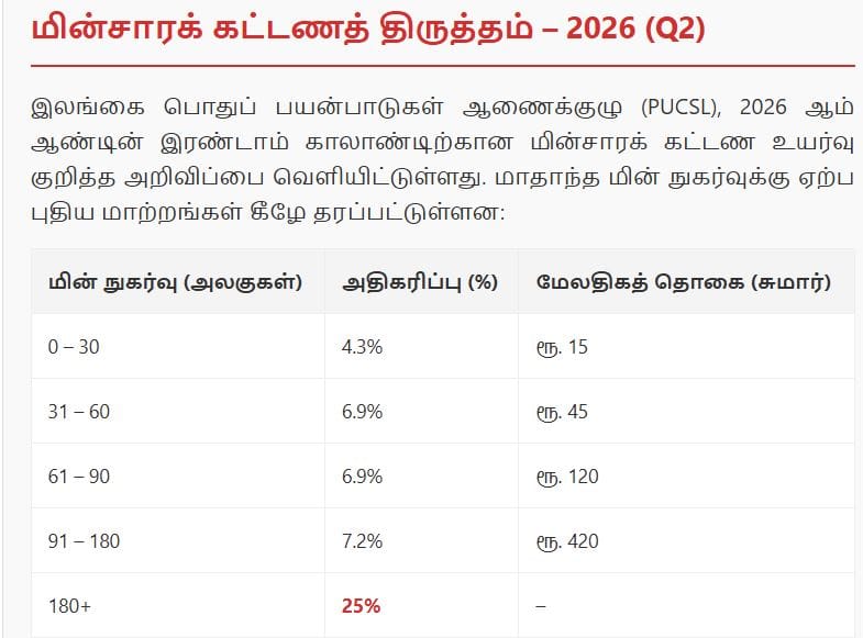 English Post / Sinhala Post / Tamil PostElectricity rates have been increased From April 1st March 30, 2026March 30, 2026 WhatsApp Channel : Click HereWhatsApp Group : Click HereFacebook Page : Click HereFacebook Group : Click Here