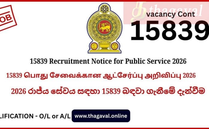 English Post / Sinhala Post / Tamil Post15839 Recruitment Notice for Public Service 2026 March 5, 2026March 5, 2026 - by Jaber - Leave a Comment 15839 Recruitment Notice for Public Service 2026 Full Details