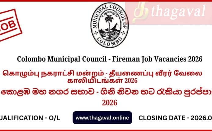 English Post / Sinhala Post / Tamil PostColombo Municipal Council – Fireman Job Vacancies 2026 March 3, 2026March 3, 2026 - by Jaber - Leave a Comment Colombo Municipal Council – Fireman Job Vacancies 2026 Full Details
