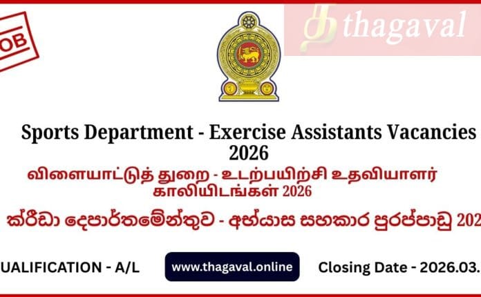 English Post / Sinhala Post / Tamil PostSports Department – Exercise Assistants Vacancies 2026 March 5, 2026March 5, 2026 - by Jaber - Leave a Comment Sports Department – Exercise Assistants Vacancies 2026 Full Details
