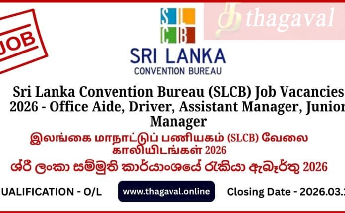 English Post / Sinhala Post / Tamil PostSri Lanka Convention Bureau (SLCB) Job Vacancies 2026 – Office Aide, Driver, Assistant Manager, Junior Manager March 7, 2026March 7, 2026 - by Jaber - Leave a Comment Sri Lanka Convention Bureau (SLCB) Job Vacancies 2026 – Office Aide, Driver, Assistant Manager, Junior Manager Full Details